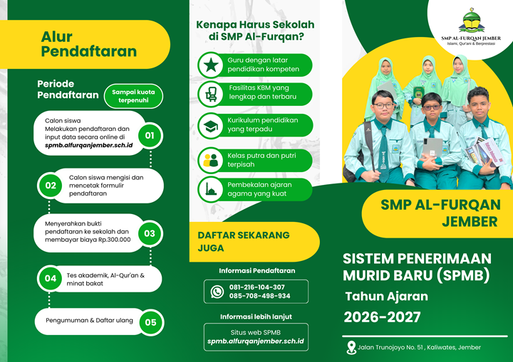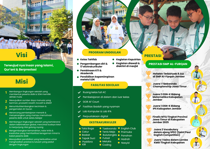 #SMPAlFurqanJember #PenerimaanMuridBaru #SPMB2026 #SekolahIslami #SekolahBerprestasi #QuraniDanBerkarakter #PPDB2026 #SMPTerbaikJember #SekolahTahfidz #SantriBerprestasi #BelajarDenganHati #GenerasiQurani #SMPIslamJember