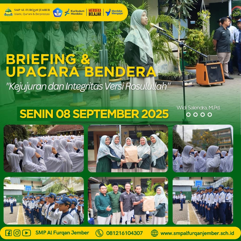 SMP Al-Furqan Jember melaksanakan kegiatan Briefing & Upacara Bendera yang rutin diadakan setiap pekan. Pada kesempatan kali ini, Ibu Widi Salendra, M.Pd. bertindak sebagai pembina upacara dengan menyampaikan amanat bertema “Kejujuran dan Integritas Versi Rasulullah”.