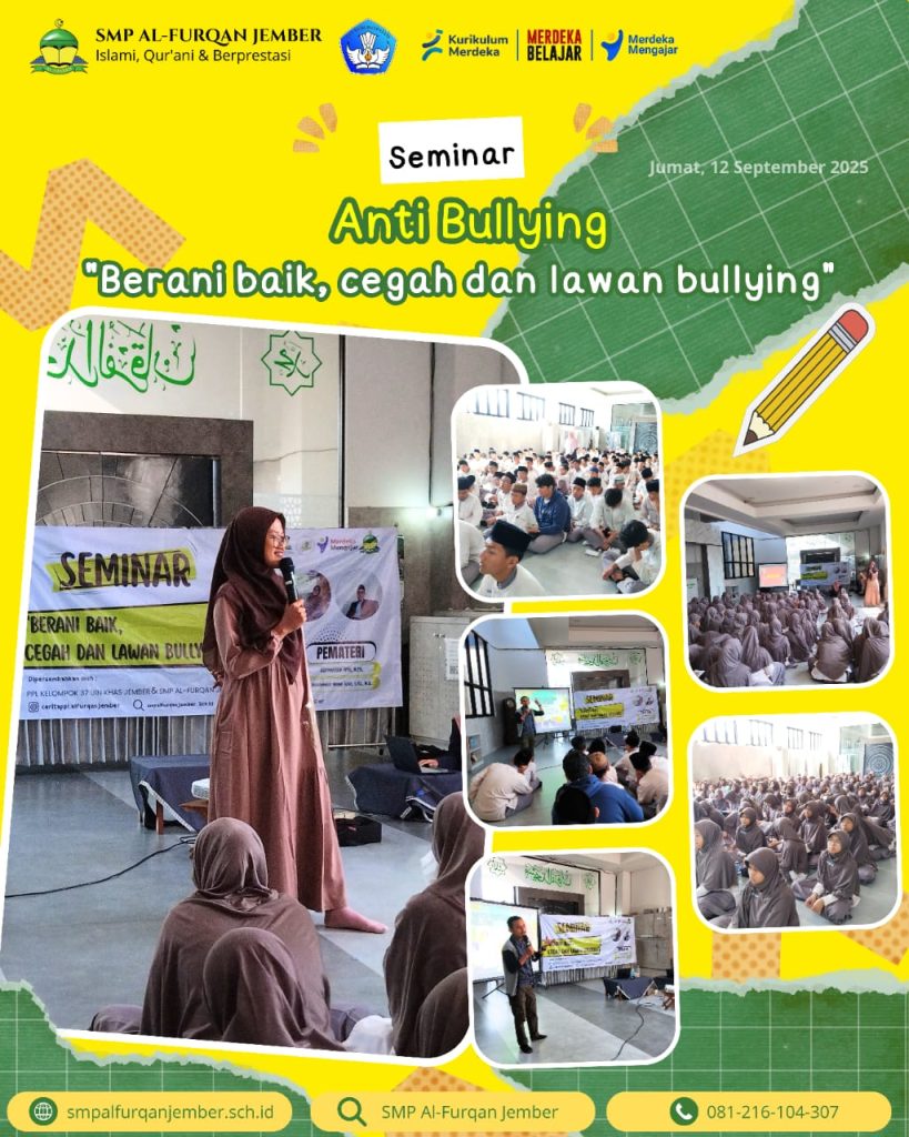 SMP Al-Furqan Jember bersama Mahasiswa PPL dari UIN Khas Jember menyelenggarakan Seminar Anti Bullying dengan tema “Berani Baik, Cegah dan Lawan Bullying”. Kegiatan ini diikuti oleh seluruh siswa dengan antusias, sebagai bentuk edukasi dan pembekalan penting untuk membangun lingkungan sekolah yang aman, nyaman, dan bebas dari perundungan.
