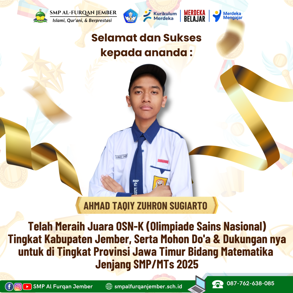 SMP Al-Furqan Jember dengan bangga mengucapkan selamat dan sukses kepada ananda Ahmad Taqiy Zuhron Sugiarto, yang telah berhasil meraih Juara 2 Olimpiade Sains Nasional – Kabupaten (OSN-K) Tahun 2025 pada bidang Matematika jenjang SMP/MTs.